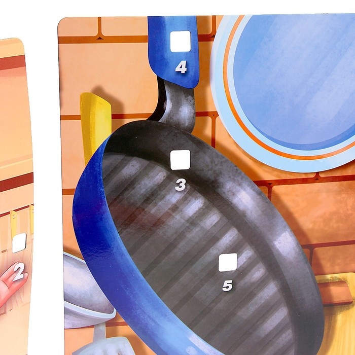 - Все пластиковые препятствия и места для них на кухонных зонах пронумерованы. Вставьте препятствия в карточки в соответствии с номерами.