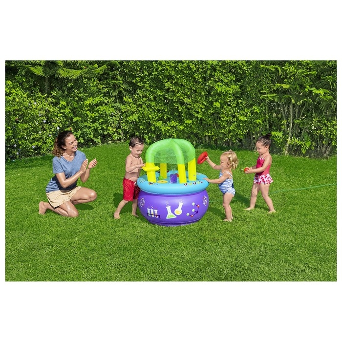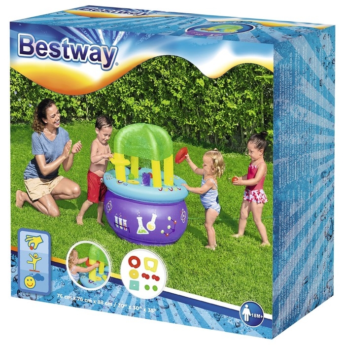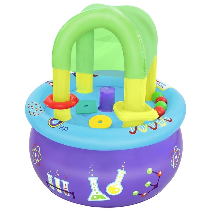 Надувной стол в виде лаборатории можно использовать дома без воды и на улице с подключением к садовому шлангу. С ранних лет малыш будет сам ставить эксперименты: проверять, какие игрушки остаются на поверхности, какие уходят под воду.