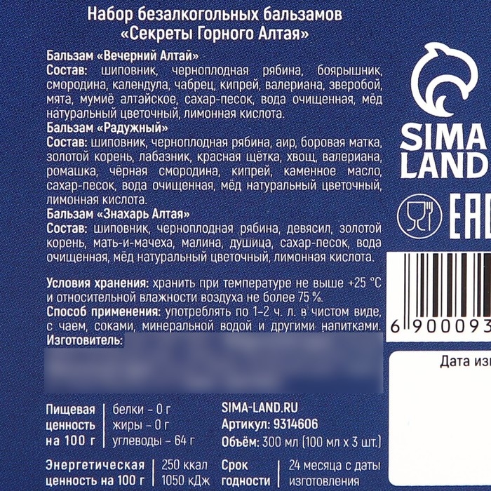 Состав: шиповник, черноплодная рябина, боярышник, смородина, календула, чабрец, кипрей, валериана, зверобой, мята, мумиё алтайское, сахар-песок, вода очищенная, мёд натуральный цветочный, лимонная кислота.