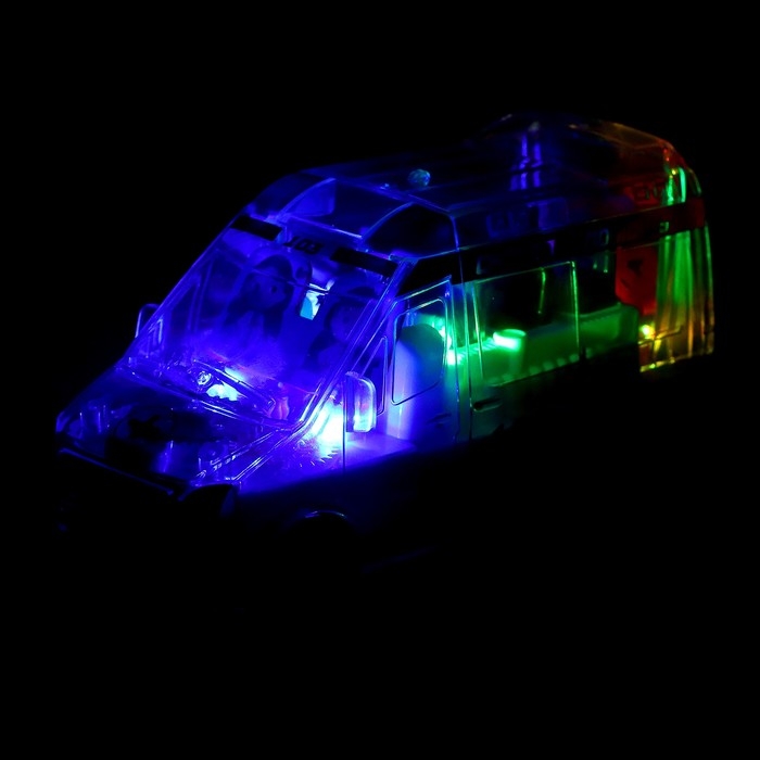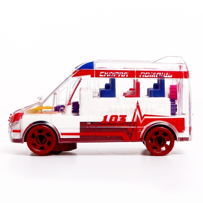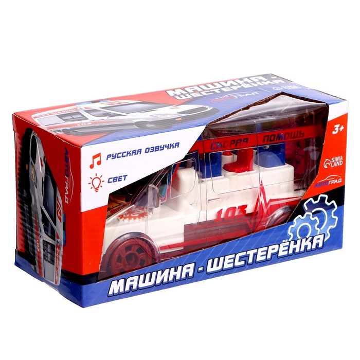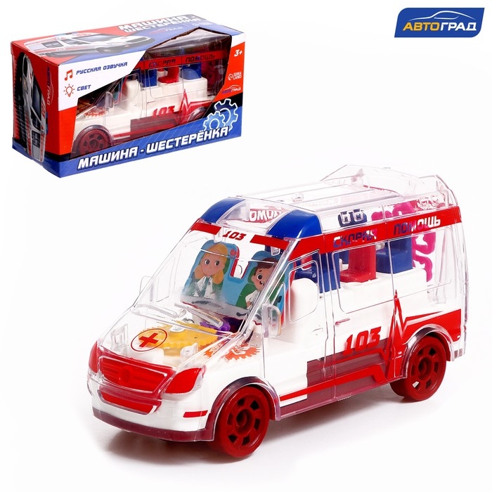 Машина-шестерёнка «Скорая помощь» — это транспорт с прозрачным корпусом. У него внутри есть подсветка и движущиеся шестерёнки! Машинка объезжает встречающиеся препятствия и воспроизводит фразы на русском языке.