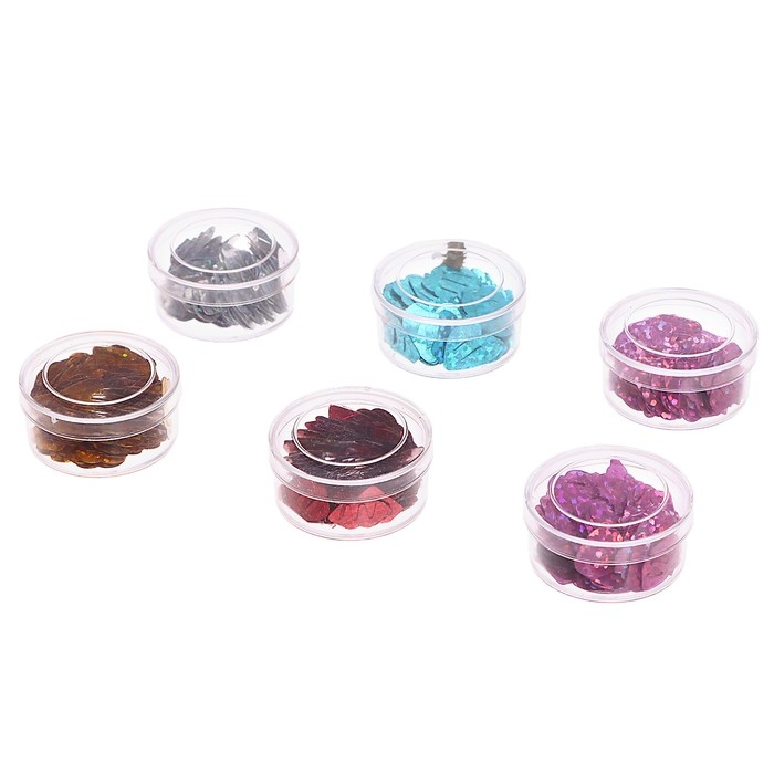 - 6 баночек с блёстками различных цветов и форм.