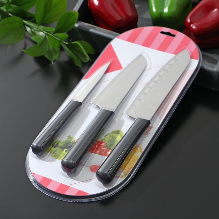 Набор кухонных ножей «Энеолит», 3 предмета: лезвие 8,5 см, 15 см, 17 см, цвет чёрный