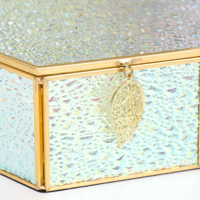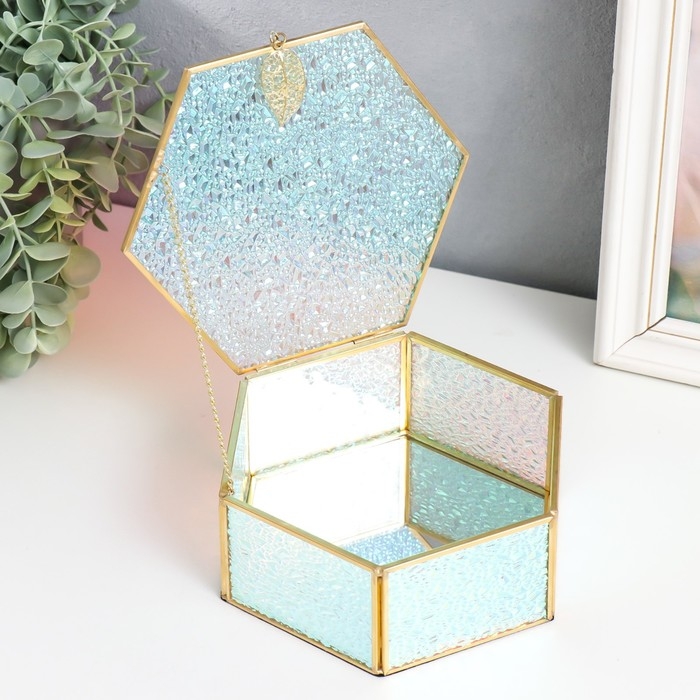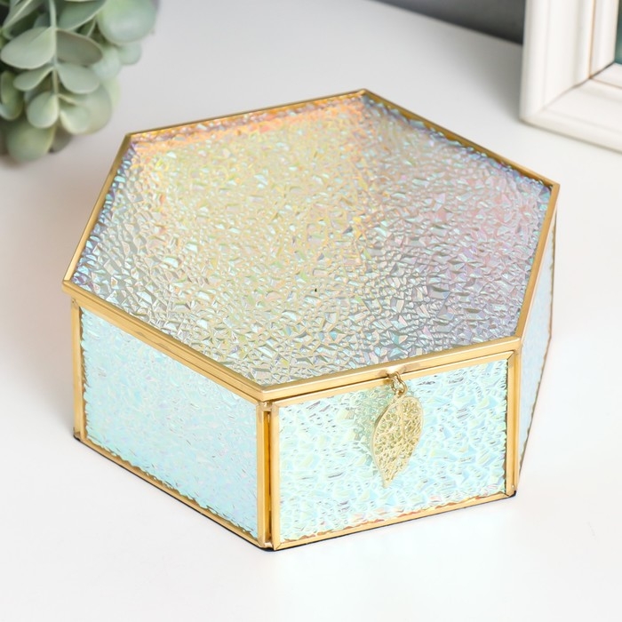 Шкатулка стекло с металлическим каркасом "Шестигранник с листом. Капли" 17х14,8х6,5 см
