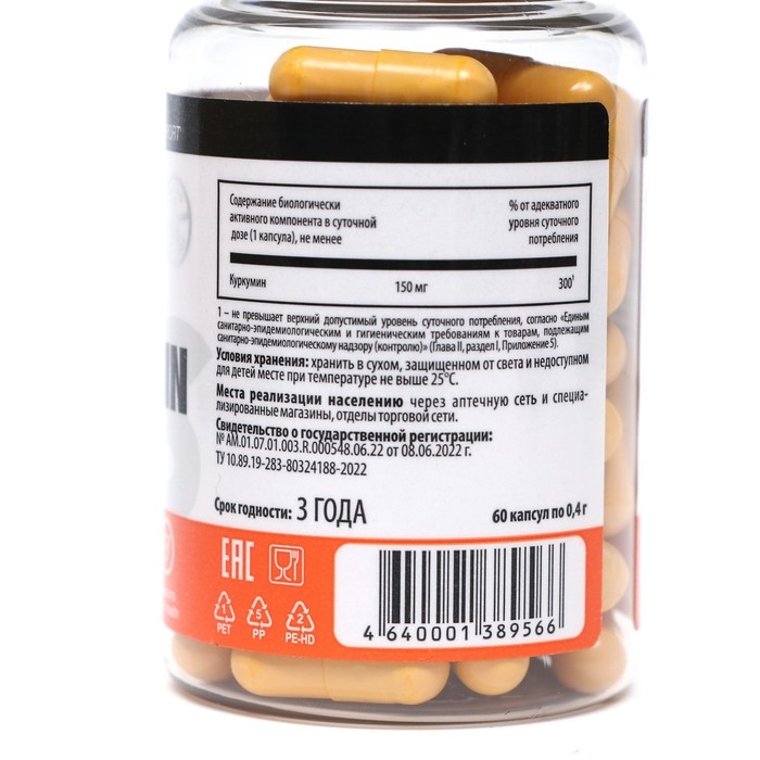 Состав: экстракт куркумы, оболочка капсулы, целлюлоза микрокристаллическая, поливинилпирролидон, кальциевая соль стеариновой кислоты.