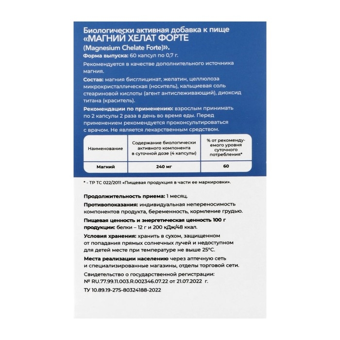 Магний хелат форте, 60 капсул по 0,7 г
