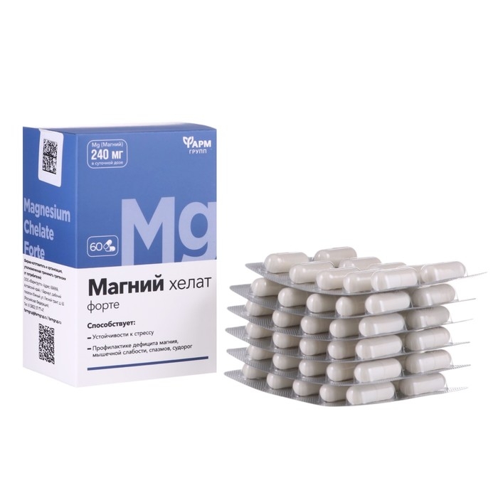 Рекомендуется в качестве дополнительного источника Магния. Магний – жизненно необходимый макроэлемент, без которого не обходится обмен веществ. Даже при небольшом дефиците магния организм не может правильно функционировать. Магний также способствует устойчивости к стрессу и просто необходим при дифиците магния в организме, мышечной слабости, спазмов и судорог. Магний Хелат Форте максимально восполняет дефицит магния. Хелатная форма - это самая легкодоступная форма минералов на сегодняшний день, представляет собой соединение минерала и аминокислоты. Хелатная форма минералов наиболее близка нашему организму и не требуют дополнительных биохимических превращений, так как уже подготовлены к усвоению организмом.