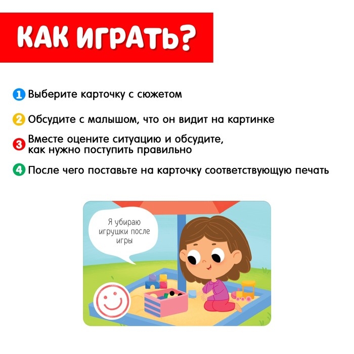 - Поставьте на карточку печать с улыбкой, если на ней изображён хороший поступок, и грустный смайлик, если ситуация на картинке показывает неправильное поведение.