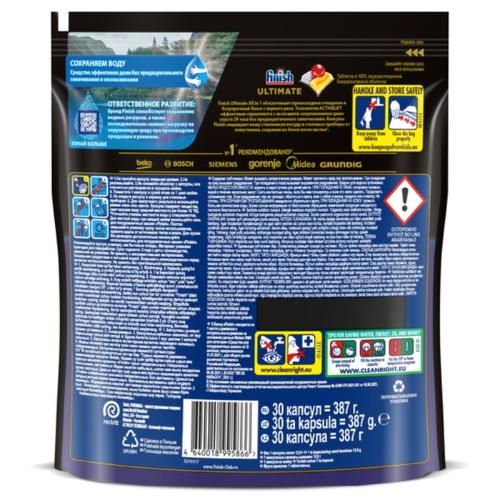 Finish Ultimate All in 1 обеспечивает превосходное очищение и безупречный блеск с первого раза. Технология ACTIVELIFT эффективно справляется с засохшими загрязнениями даже спустя 24 часа без предварительного замачивания. Каждая капсула состоит из трех частей: порошок - удаляет сложные загрязнения, синий гель - нейтрализует жир, красный гель - придает ослепительный блеск. Более того, капсулы Finish Ultimate All in 1 защищают вашу стеклянную посуду и столовые приборы от помутнения, сохраняя их блеск после мытья. Для достижения максимального результата и при очень жесткой воде рекомендуем попробовать специальную соль и ополаскиватель Finish.