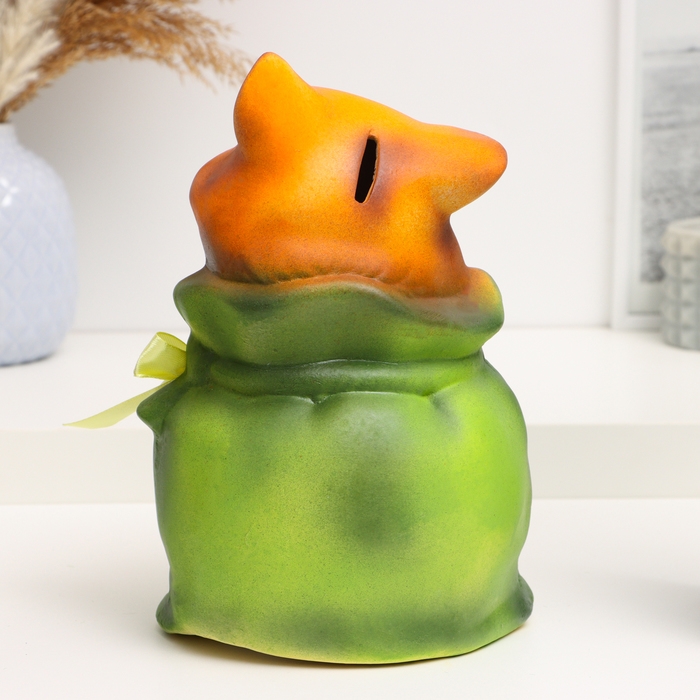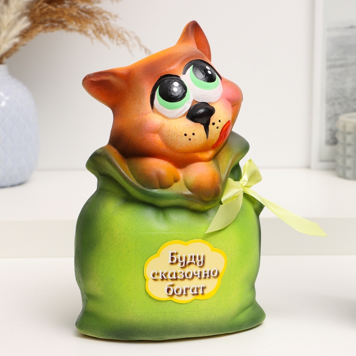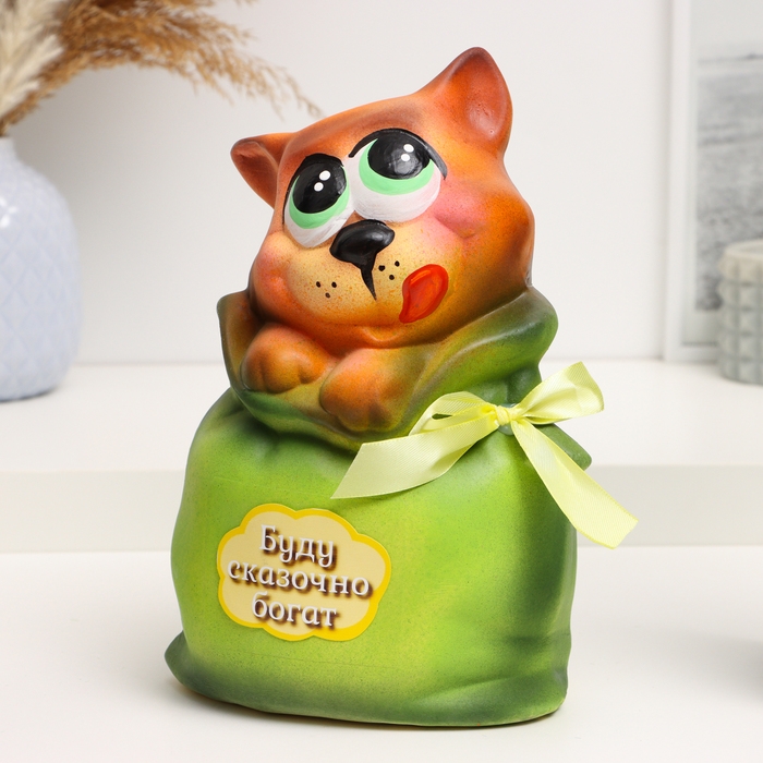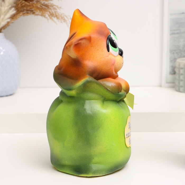 Копилка "Кот в мешке - Буду сказочно богат" рыжий с зеленым, 22см