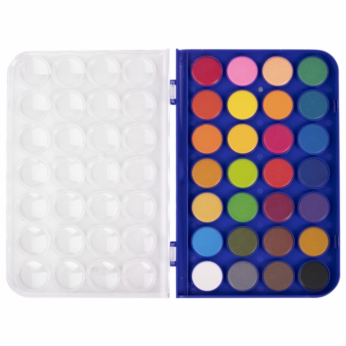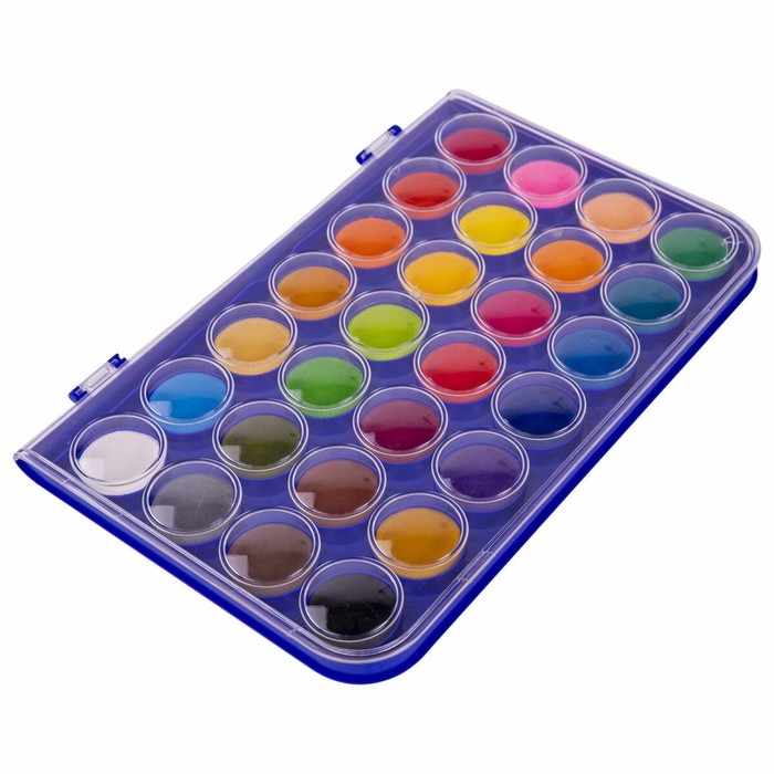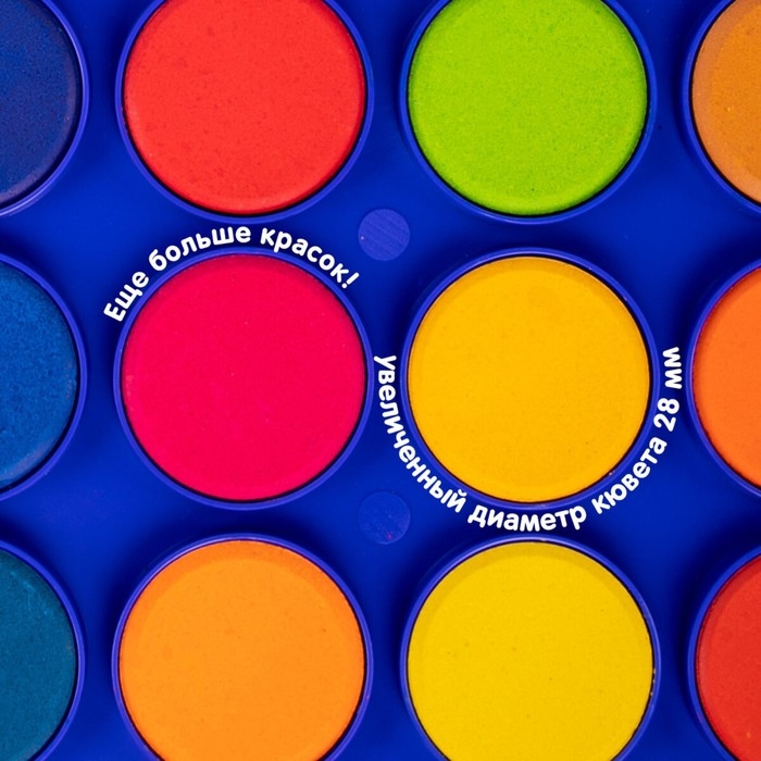 В наборе 28 насыщенных цветов, которые отлично смешиваются, позволяя создавать множество оттенков. Краски легко наносятся, образуя интенсивное яркое покрытие даже при нанесении в один слой. Обеспечивают однородное окрашивание, быстро высыхают и не портятся со временем. Краски безопасны для детей, нетоксичны. Выпускаются в пластиковом пенале с европодвесом, прозрачной крышкой, круглой формой кювет и отделением для кисточки. Съемную пластиковую крышку можно использовать в качестве палитры для смешивания красок.