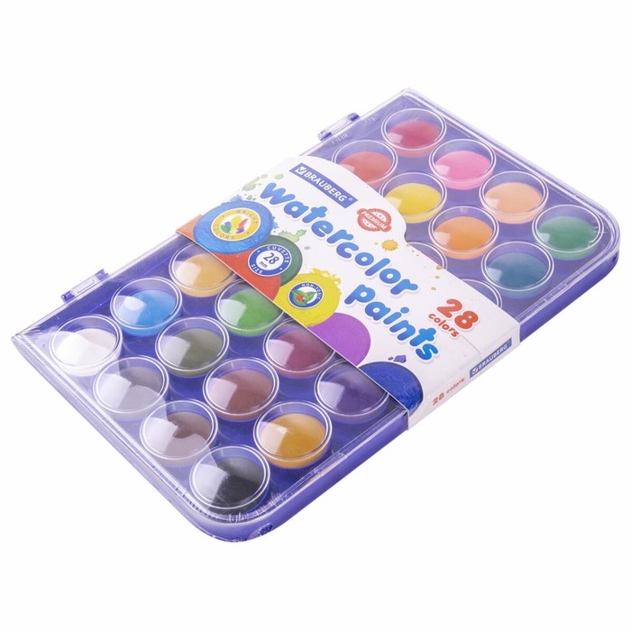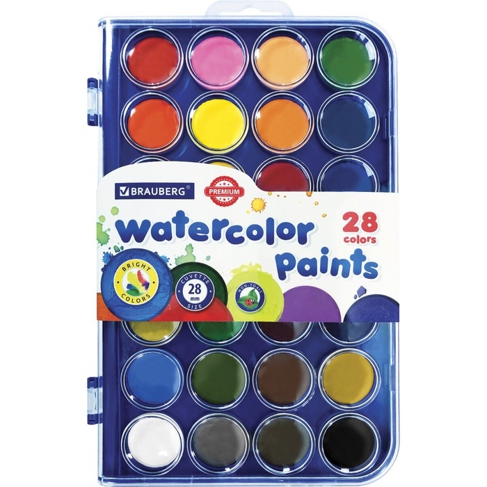 Акварель 28 цветов BRAUBERG PREMIUM, круглые кюветы 28 мм, в пенале