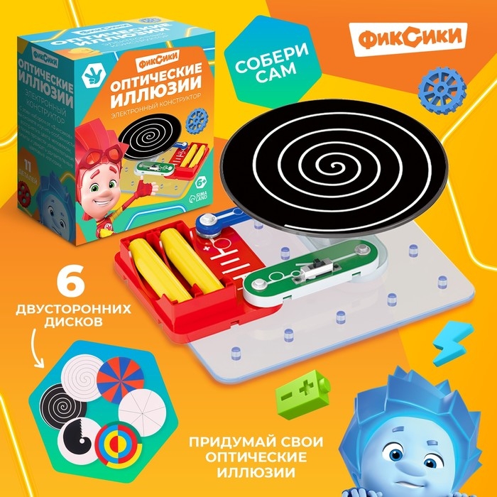Электронный конструктор Фиксики «Оптические иллюзии» поможет ребёнку узнать, как работает зрительное восприятие, и убедиться, как за счёт контраста форм, цвета, размера и перспективы обманывается наш мозг.