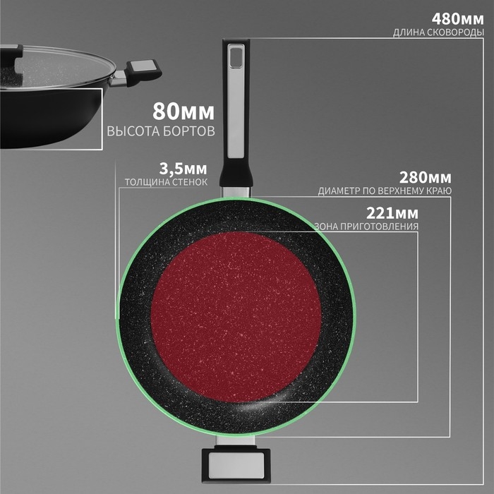 - Высококачественный кованый алюминий с толстым дном 3,5 мм сохранит форму изделия даже если сковородка была перегрета.