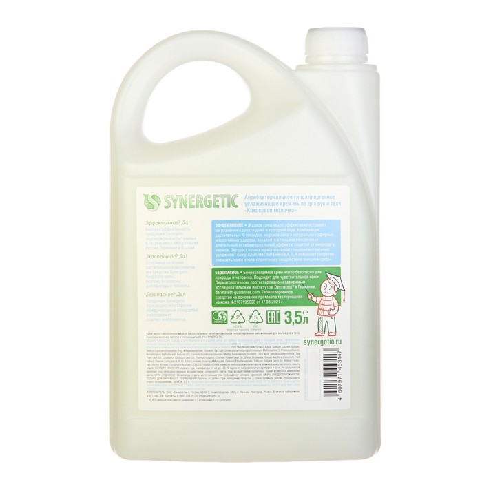 Крем-мыло Synergetic "Кокосовое молочко", антибактериальное, 3,5 л