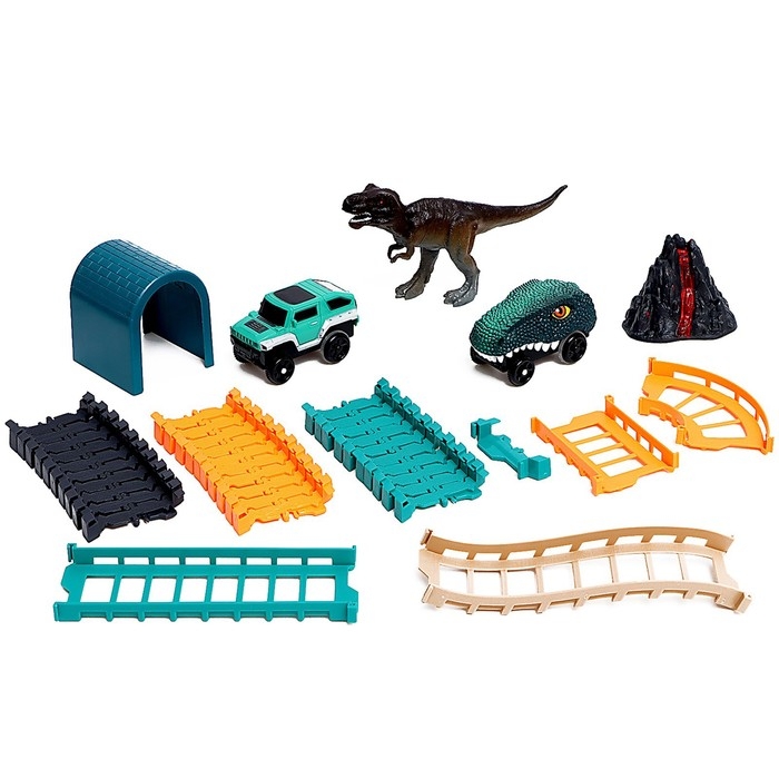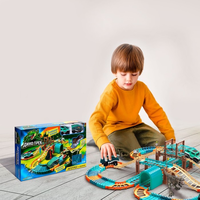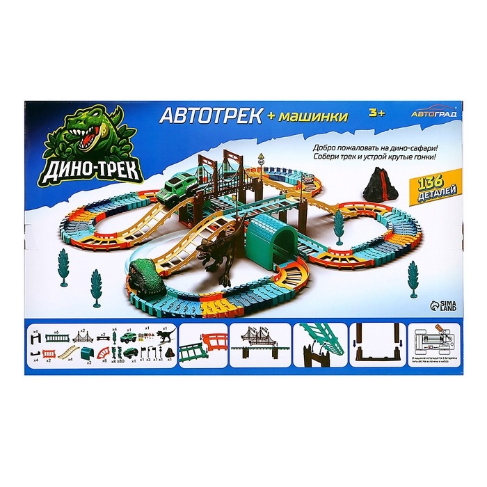 Автотрек «Динотрек» — это набор для зрелищных заездов. Трассу можно собирать как угодно. На коробке представлен вариант сборки. В комплекте две машинки.