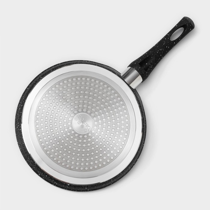 Сковорода Magistro серии Dark изготовлена из кованого алюминия и имеет сверхпрочное антипригарное покрытие, усиленное частичками мрамора. Покрытие полностью безопасно для здоровья, не содержит PFOA и других вредных веществ. В такой сковороде удобно жарить блины, оладьи, панкейки. Благодаря надежному антипригарному покрытию на сковороде можно готовить с минимальным количеством масла: продукты не прилипнут, не подгорят.