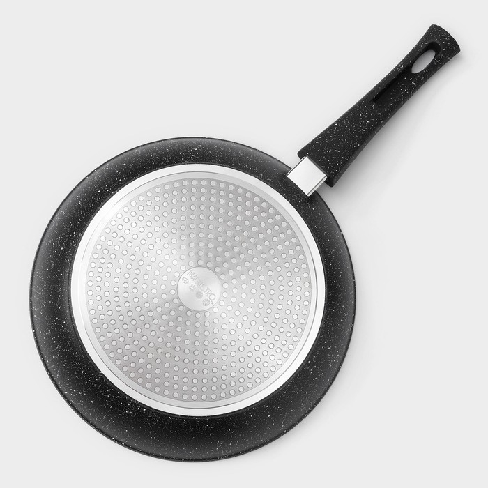 Сковорода Magistro серии Dark изготовлена из кованого алюминия, имеет прочное антипригарное покрытие с вкраплениями мраморных частиц. В такой посуде удобно жарить, тушить, она прекрасно сохраняет сочность мяса, рыбы, птицы и овощей.