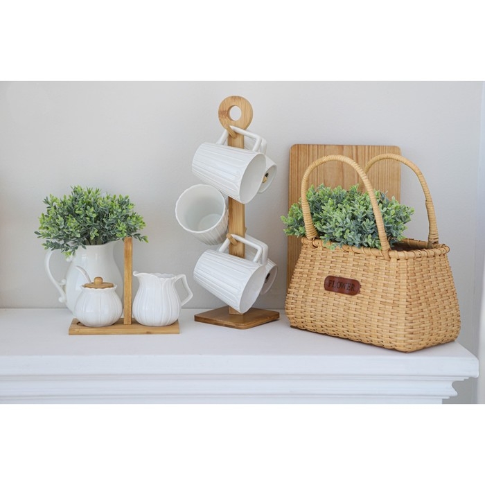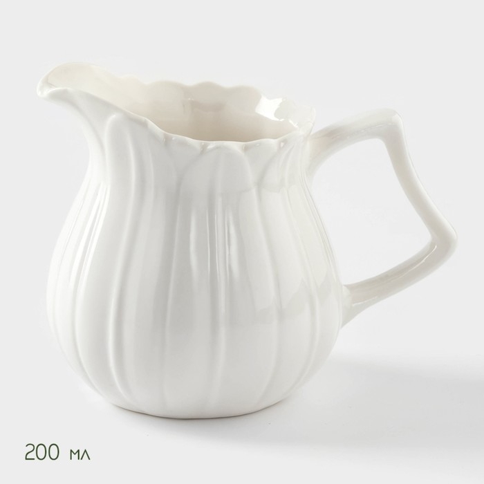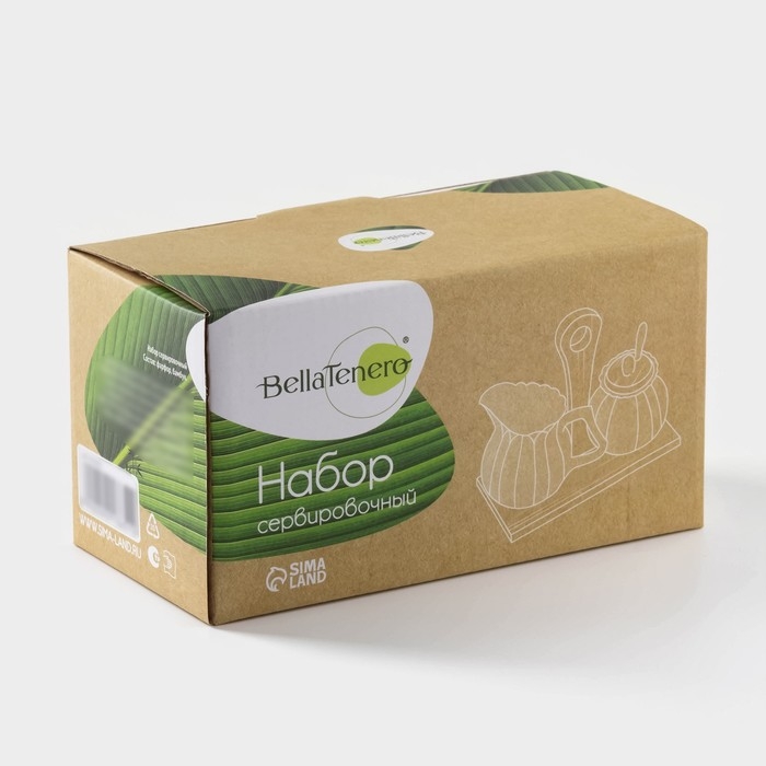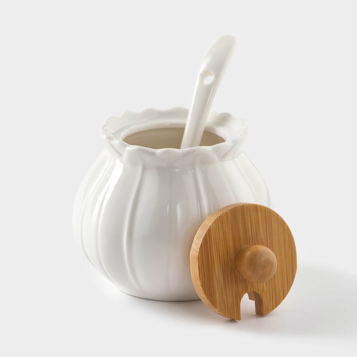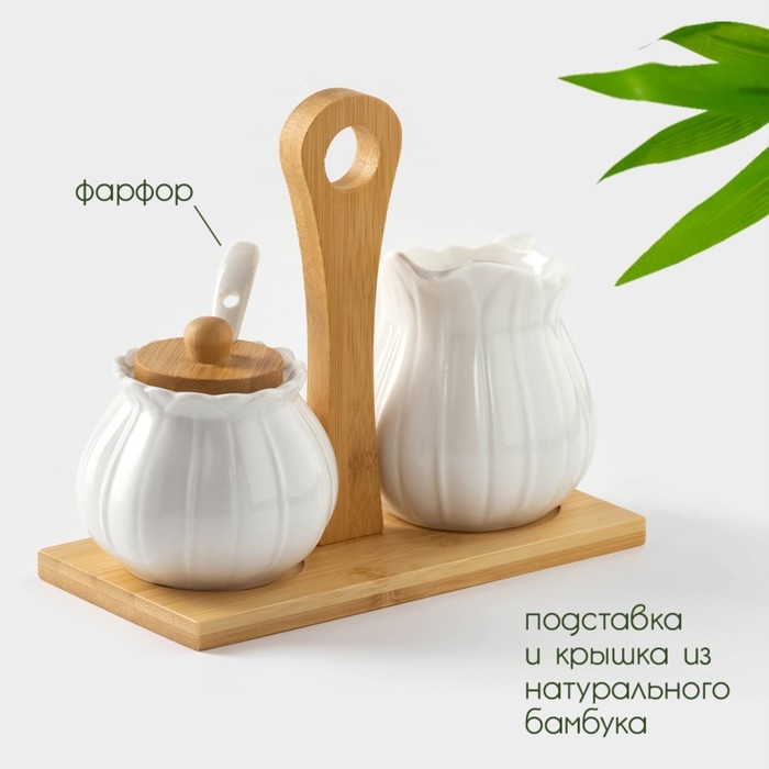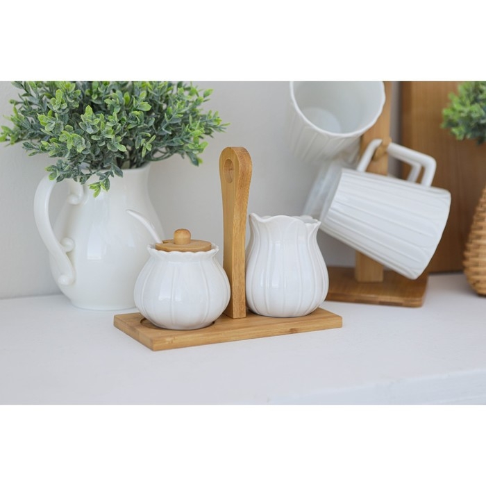 Набор фарфоровый сервировочный BellaTenero «Тюльпан», 4 предмета: молочник 200 мл, сахарница с крышкой 170 мл, бамбуковая подставка, ложка, цвет белый