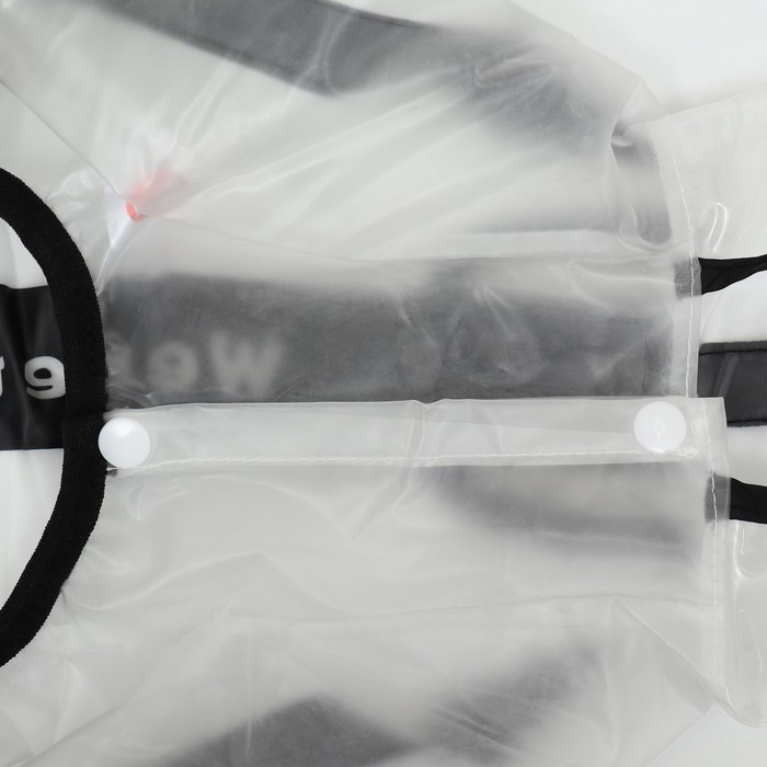 Непромокаемая прочная ткань. Большой капюшон с прозрачным экраном защитит собаку от сильного ветра и дождя. Легко одевается, застегивается на кнопки на животе, пах открыт.