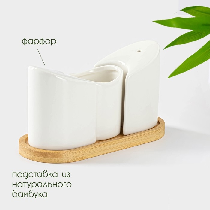 Набор фарфоровый для специй на бамбуковой подставке BellaTenero «Листья», 4 предмета: солонка 120 мл, перечница 120 мл, салфетница, подставка, цвет белый