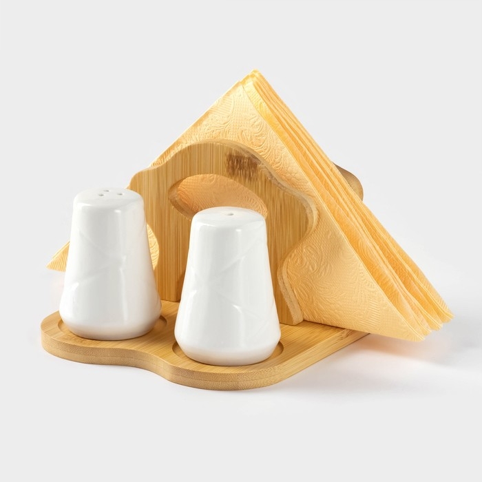 Набор для специй на деревянной подставке BellaTenero, 3 предмета: солонка 60 мл, перечница 60 мл, салфетница, цвет белый