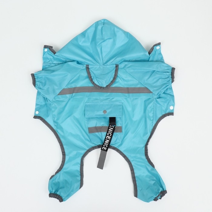 Комбинезон застегивается на кнопки, на лапах есть утягивающие резиночки, а на капюшоне есть прозрачный козырек, который защитит вашего питомца от ветра, пыли и дождя.