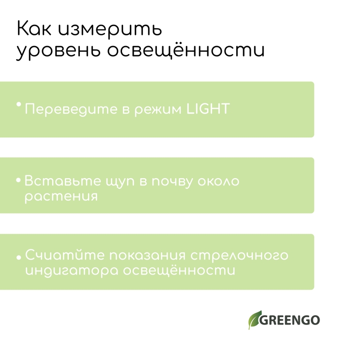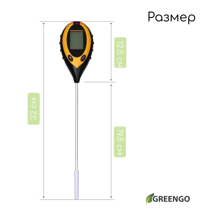 Измеритель почвы 4 в 1: для влажности, кислотности, освещёности и температуры, Greengo