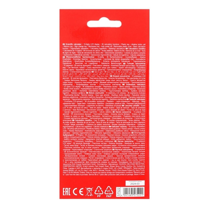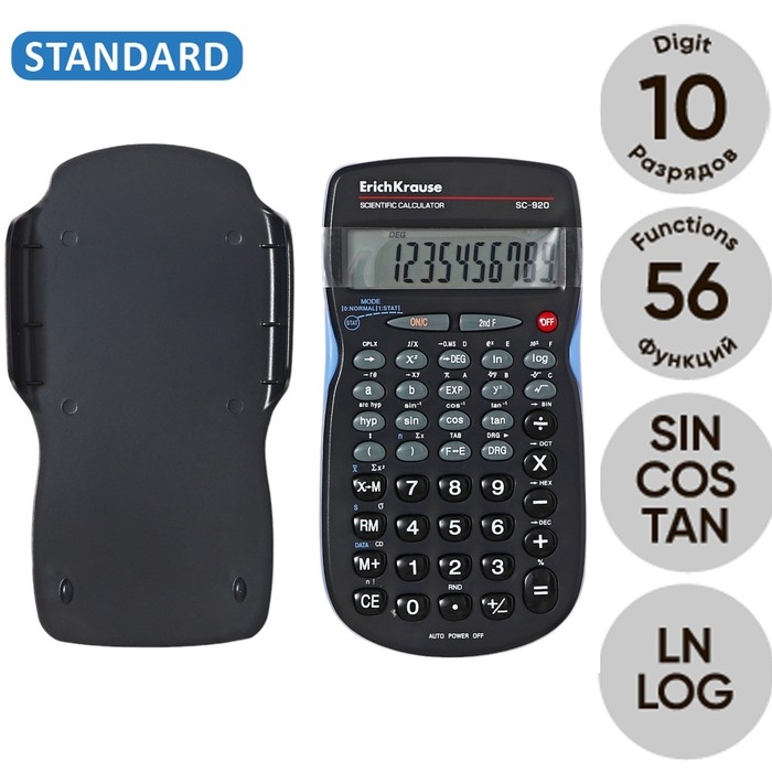 Научный калькулятор непрограммируемый в пластиковом корпусе с прорезиненной окантовкой с 10-разрядным ЖК - дисплеем. Оптимальный набор 56 вычислительных функций позволяет совершать основные математические операции, рассчитывать проценты, наценку, извлекать квадратный корень, суммировать произведенные операции и запоминать промежуточный результат, рассчитывать логарифмы, совершать тригонометрические операции, осуществлять статистические расчёты. Источник питания - алкалиновая батарея. Для экономии энергии предусмотрена функция автоматического выключения. Для защиты от загрязнений, повреждений и случайного включения калькулятор оснащен съемной пластиковой крышкой. Рекомендован к использованию в образовательных учреждениях общего среднего образования, в том числе при сдаче ОГЭ и ЕГЭ.