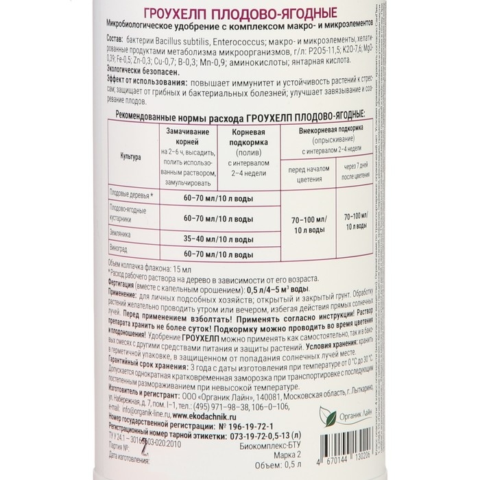 Удобрение жидкое ГРОУХЕЛП для плодово-ягодных растений, 500 мл