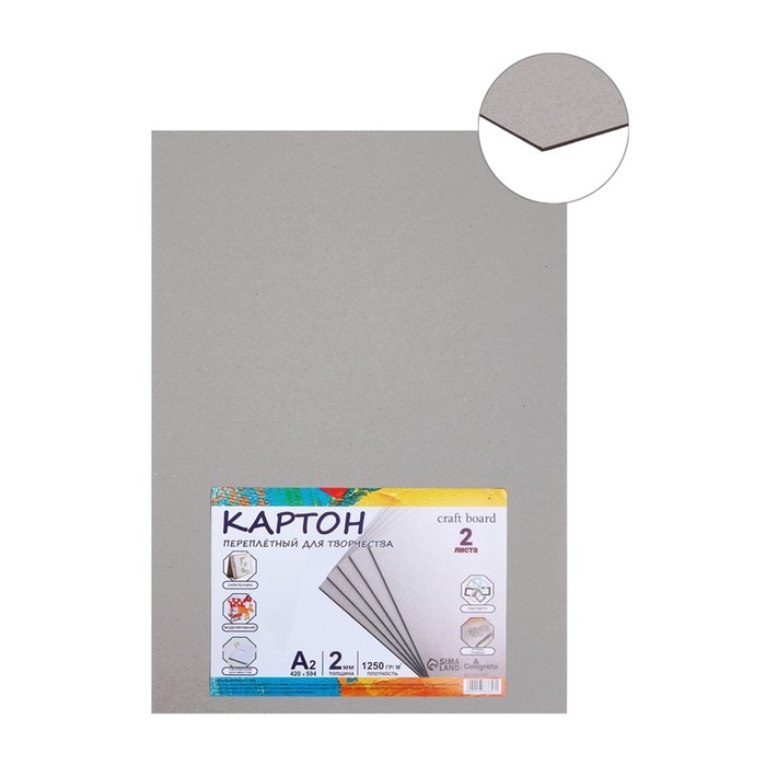 Картон переплётный 2.0 мм, А2, 2 листа, 1250 г/м², серый, в пакете