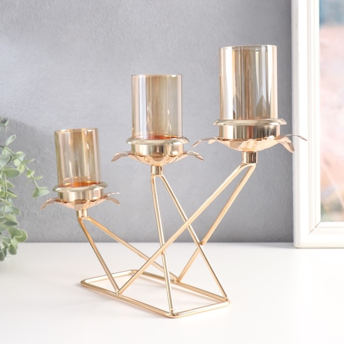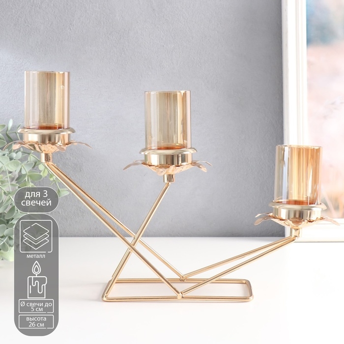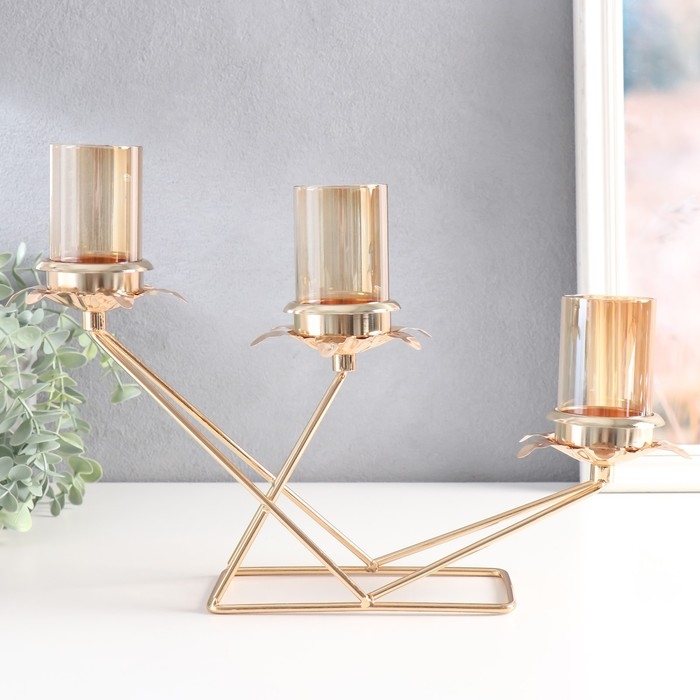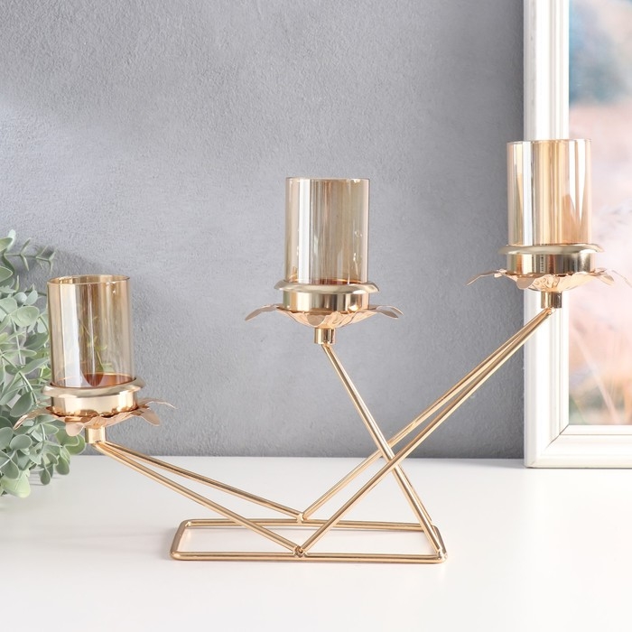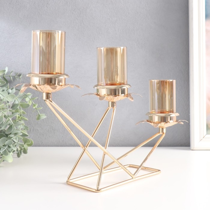 Подсвечник металл, стекло на 3 свечи "Ветви с листиками. Геометрия" d-5 см золото 35х8х26 см 94487