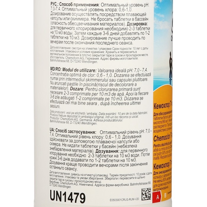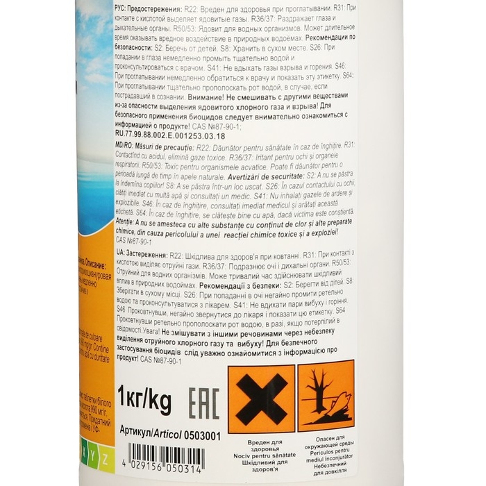 Меры предосторожности: соблюдайте меры по безопасности, указанные на этикетке продукта и в паспорте безопасности. Продукт хранить в оригинальной упаковке в прохладном и защищённом от солнца месте. Продукт хранить и перевозить стоя! Внимание: Не смешивать с другими химикатами! При смеси с другими хлорными продуктами опасность выделения ядовитых газов и взрыва!