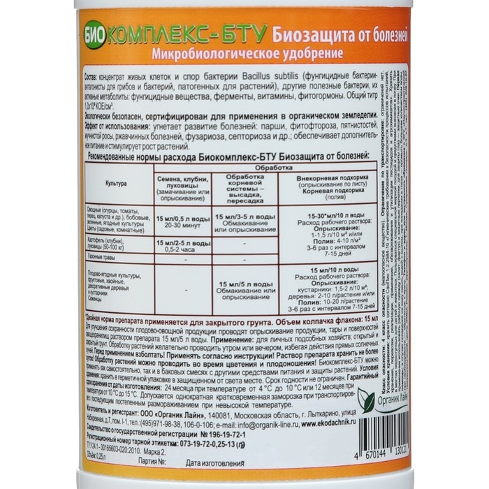 Препарат сертифицирован для применения в органическом земледелии.