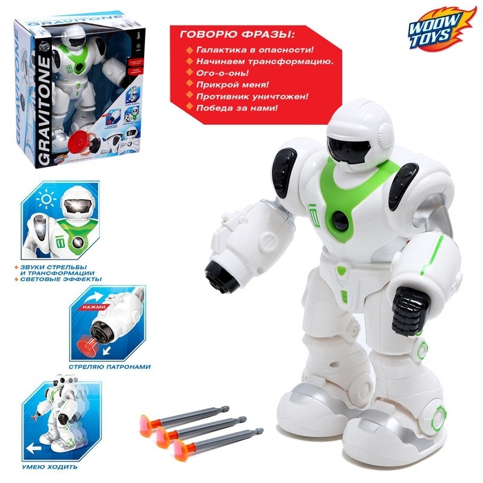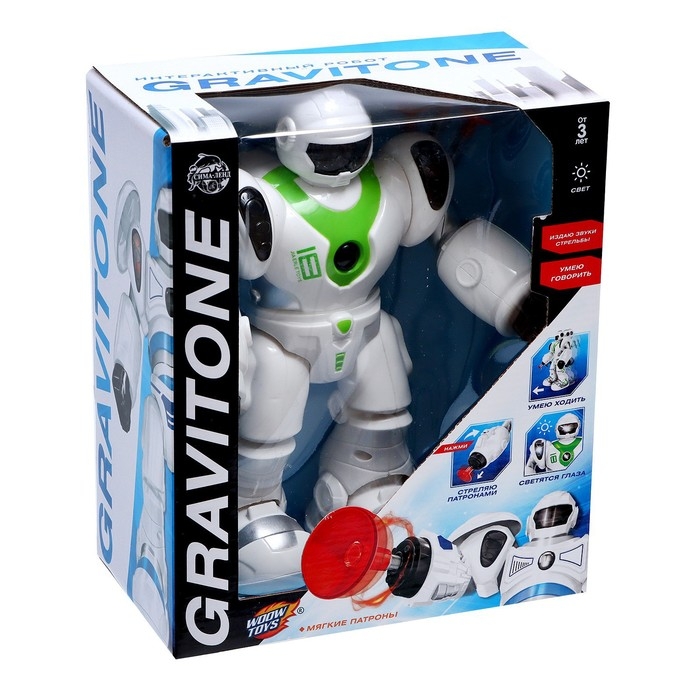 Робот GRAVITONE станет верным спутником ребёнка. С ним малыш воплотит сюжеты, связанные с исследованием глубин космоса или спасением мира от инопланетных захватчиков! Игрушка умеет ходить, говорить на русском языке и стрелять мягкими патронами.