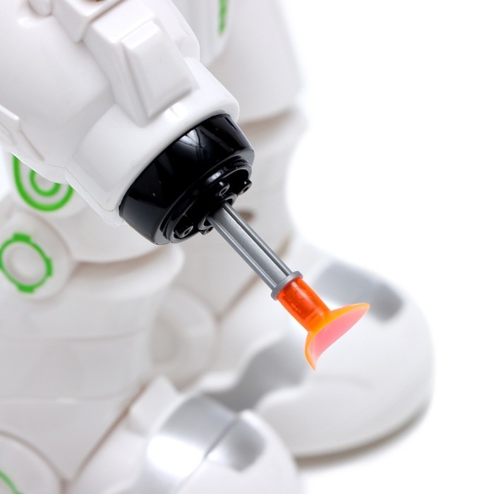 - Рука робота оснащена пушкой, которая стреляет патронами с присоской.