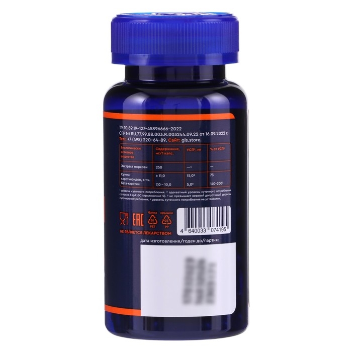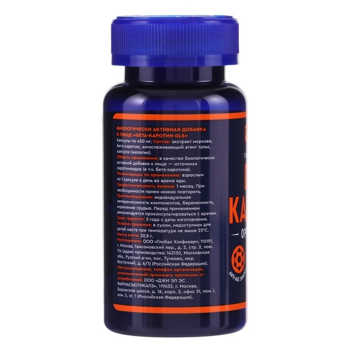 Бета-Каротин GLS для зрения и кожи, 60 капсул по 450 мг