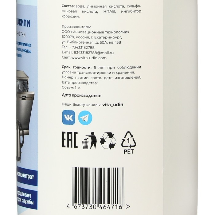 Концентрированный очиститель накипи средство для кофемашин VITA UDIN Для очистки от накипи, продуктов коррозии, солей жесткости водонагревательных поверхностей оборудования, кухонных приборов, а также инвентаря, тары, поверхностей помещений.