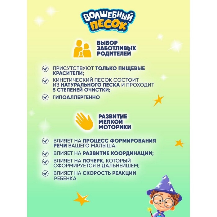 Кинетический песок обладает уникальной воздушной структурой, позволяя прочувствовать каждую песчинку. Он отлично лепится и держит форму, поэтому можно создавать песочные замки, закапывать и искать сокровища, рисовать на песке и придумывать новые игры снова и снова! С «Волшебным песком» ваш малыш будет часами играть и развивать важные навыки.