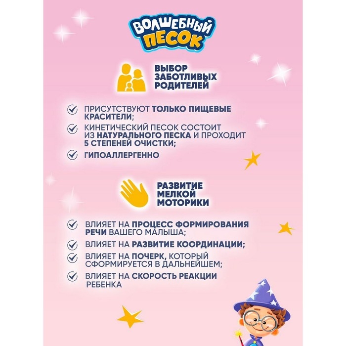 Кинетический песок обладает уникальной воздушной структурой, позволяя прочувствовать каждую песчинку. Он отлично лепится и держит форму, поэтому можно создавать песочные замки, закапывать и искать сокровища, рисовать на песке и придумывать новые игры снова и снова! С «Волшебным песком» ваш малыш будет часами играть и развивать важные навыки.
