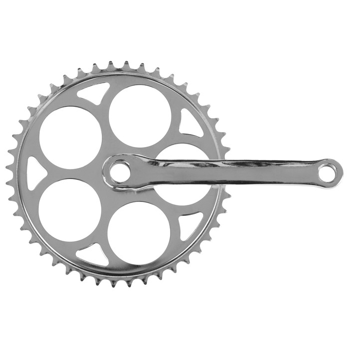 Система шатунов подойдёт для скоростных велосипедов для педали под резьбу 9/16. Система имеет 1 звезду и заглушки, подойдёт под клиновую каретку. Материал изделия – сталь.