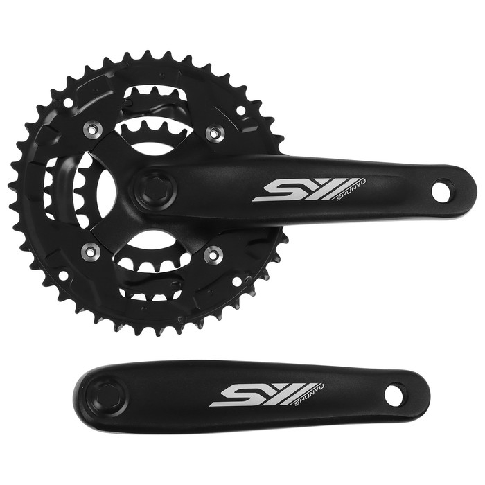 Система шатунов подойдёт для скоростных велосипедов для педали под резьбу 9/16. Система имеет 3 звезды и заглушки, подойдёт под квадратный вал. Материал изделия – алюминий.