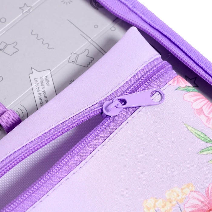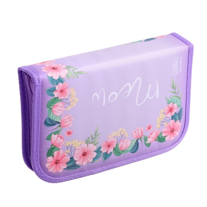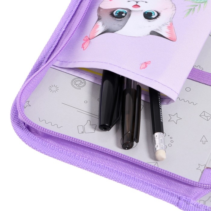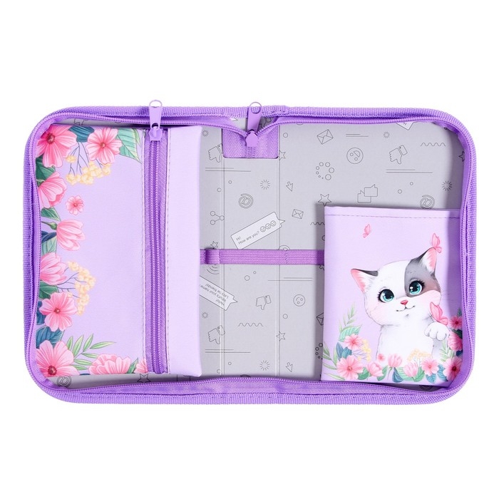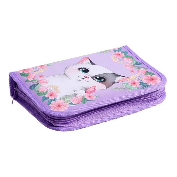 Пенал 1 секция 140 х 210 х 40 мм, откидной карман и косметичка, тканевый, Calligrata TOP Content "Котик в цветах"