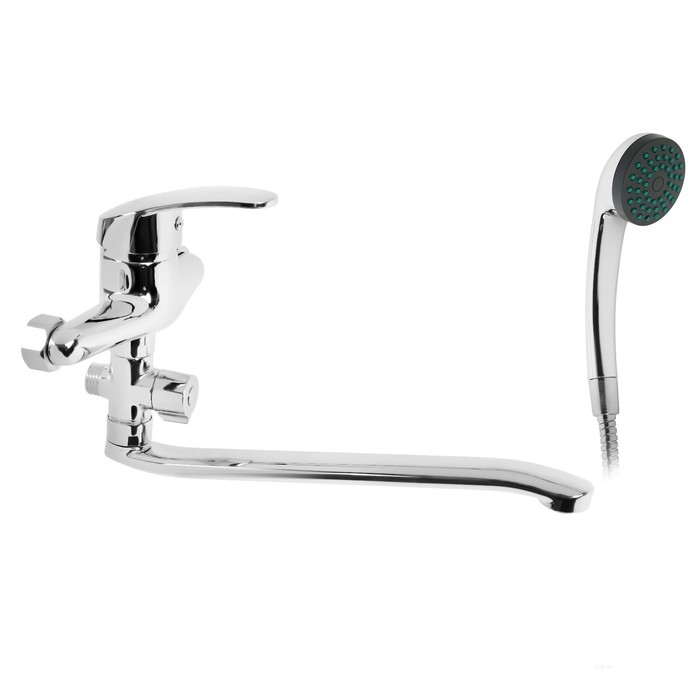 Рычажный смеситель имеет длинный и прямой излив. Режим «Душ» меняется поворотом переключателя.