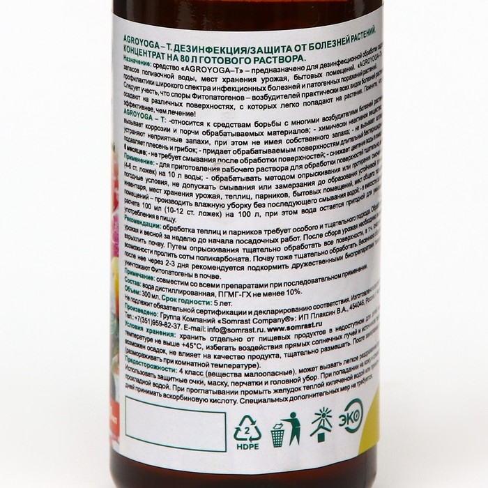 Средство «AGROYOGA–Т» – высокоэффективное средство профилактики широкого спектра инфекционных болезней и патогенных поражений растений, которое предназначено для дезинфекционной обработки садового инвентаря, теплиц, парников, запасов поливочной воды, мест хранения урожая, бытовых помещений.