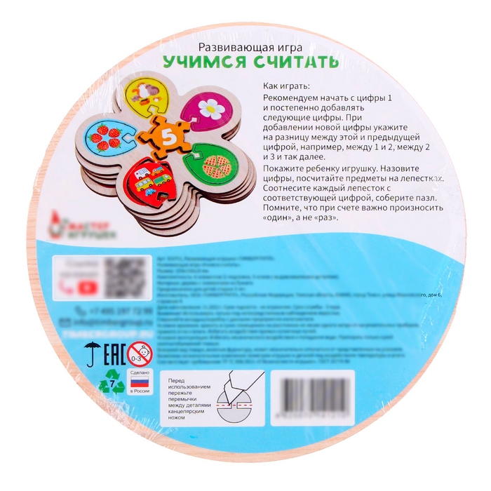 Развивающая игра «Учимся считать» — будет отличным помощником для малыша в подготовке к детскому саду. Игра помогает ребёнку установить связь между количеством предметов и числом и знакомит с понятием «сколько». Игрушка подходит для обучения счёту детей 3-5 лет.