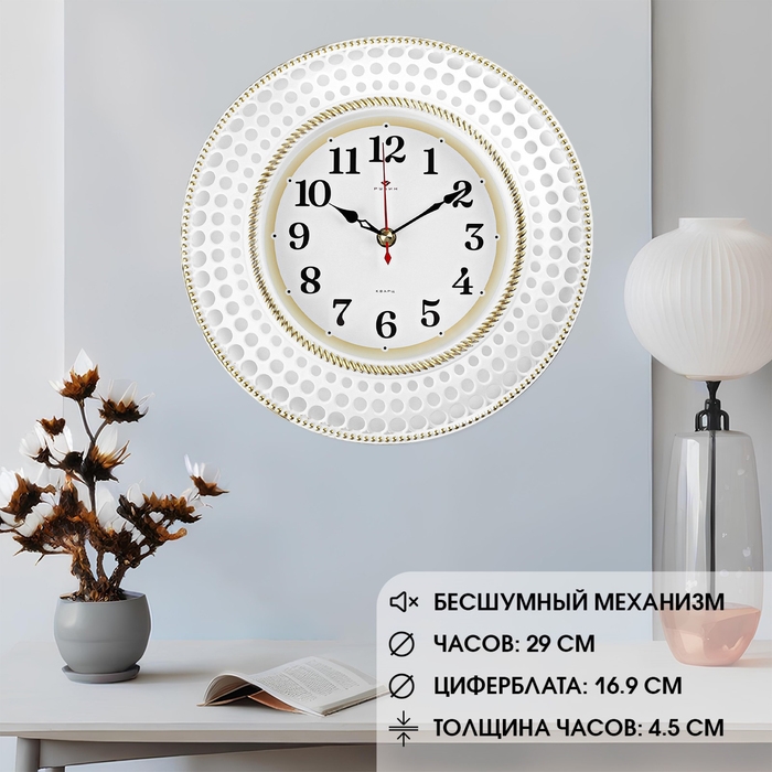 Эти часы имеют большой и удобный циферблат, который позволяет легко определить время. Механизм часов кварцевый, что обеспечивает бесшумную работу. Теперь вы можете наслаждаться тишиной и спокойствием в вашем доме, не беспокоясь о лишнем шуме.