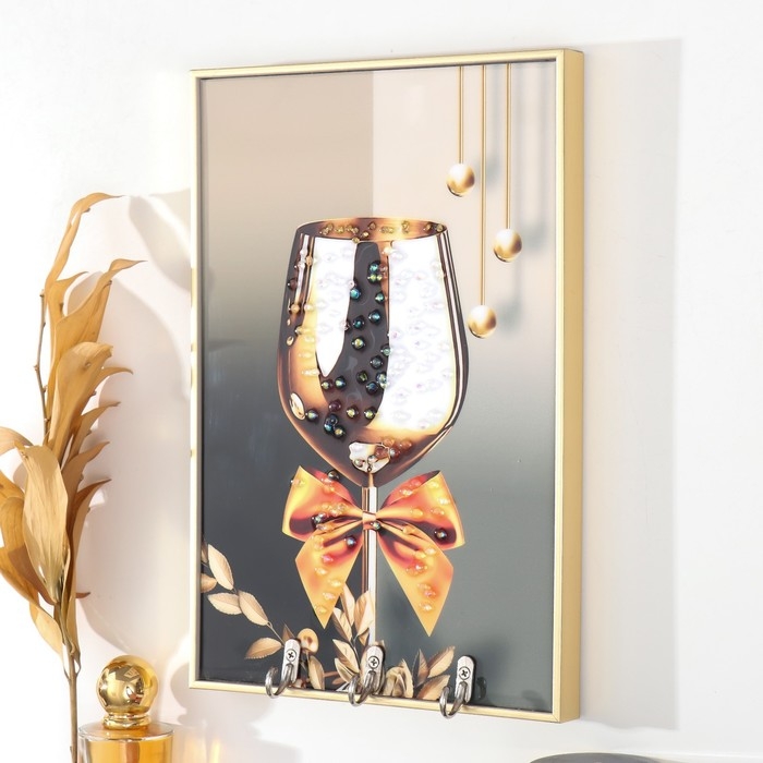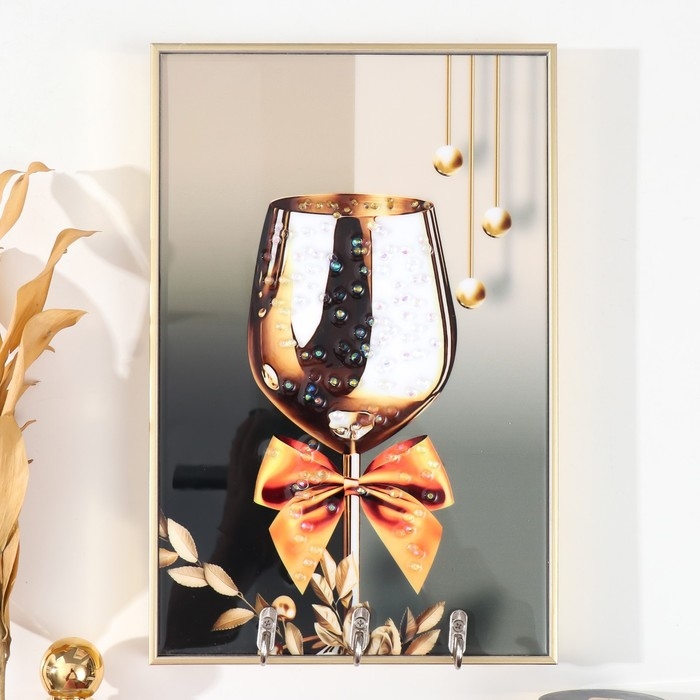 Ключница пластик, МДФ 3 крючка "Праздничный бокал" стразы, золото 19,3х1,8х29 см