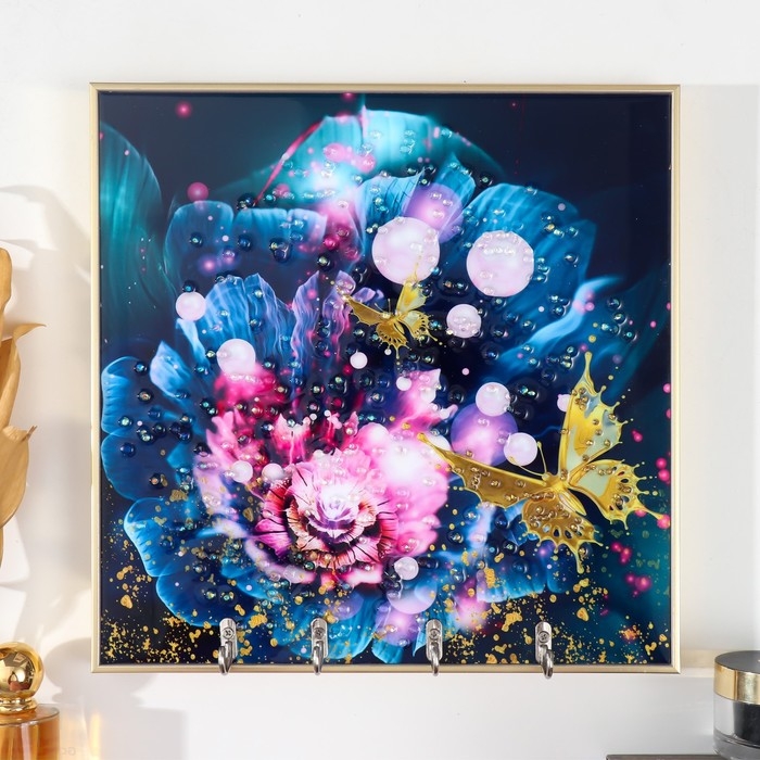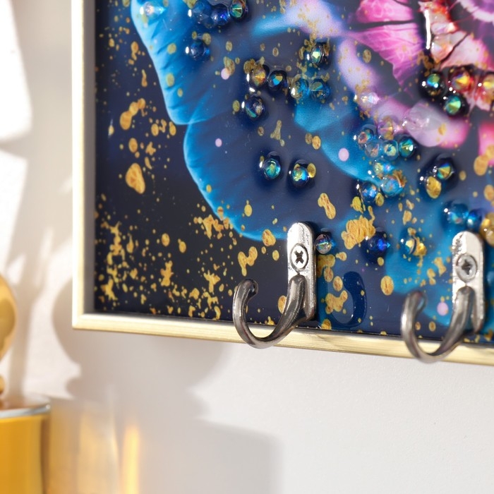 Ключница пластик, МДФ 4 крючка "Бабочки на цветке" стразы, золото 29х1,8х29 см