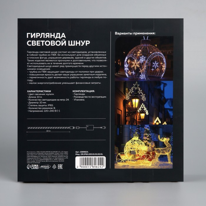 Световой шнур Luazon Lighting 10 мм, IP65, 10 м, 24 LED/м, 220 В, 8 режимов, свечение мульти