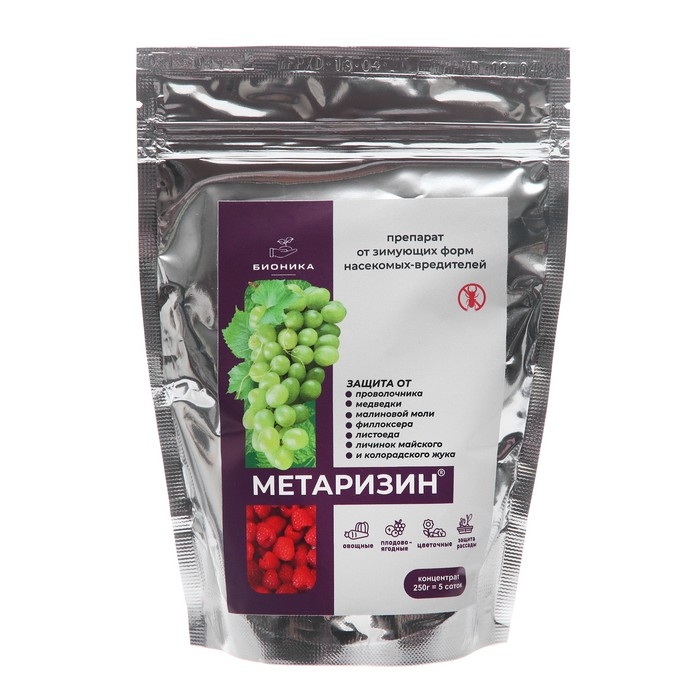 Метаризин - биологический препарат на основе высокоэффективного штамма гриба Metarhizim для защиты культурных растений от опасных насекомых вредителей обитающих в почве. Эффективен против зимующих форм насекомых вредителей: проволочник, майского жука, подгрызающей совки, медведки, мухи (белой, луковой, морковной, свекловичной минирующей), галлицы (смородиновой, яблонной), точило лукового, филлоксеры, малиновой моли, клещей (паутинного, земляничного), листовда (земляничного, крыжовникового) и личинок: майского и колорадского жука.
